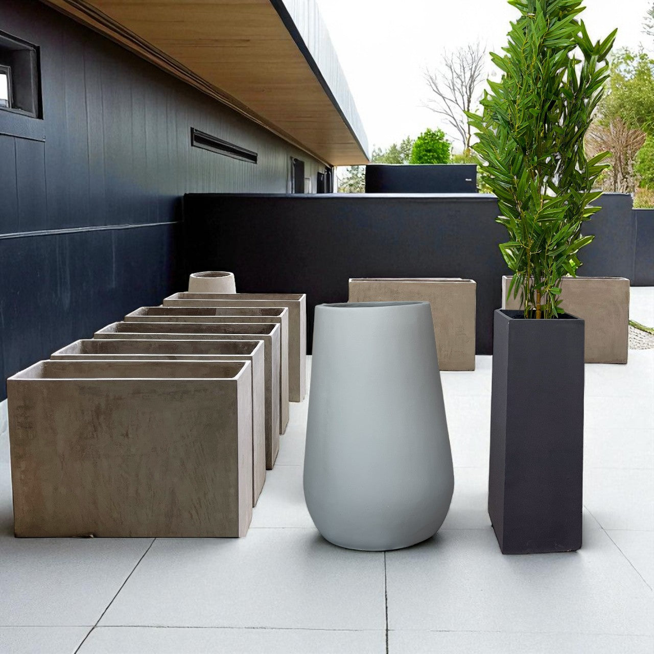 Estilizada y moderna, esta maceta es perfecta para delimitar espacios sin ocupar demasiado lugar. Su altura realza cualquier planta, creando un efecto visual elegante. Hecha de hormigón reforzado, es resistente al sol, la lluvia y los cambios de temperatura.